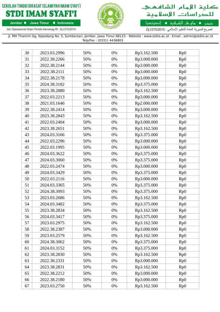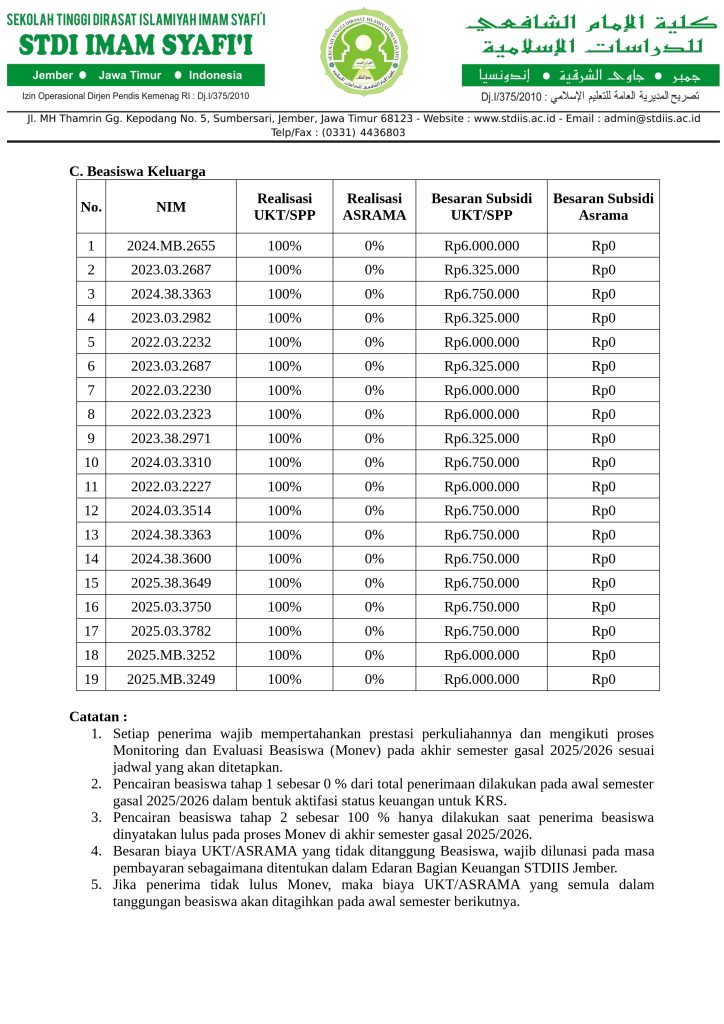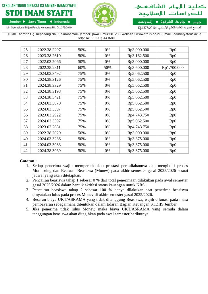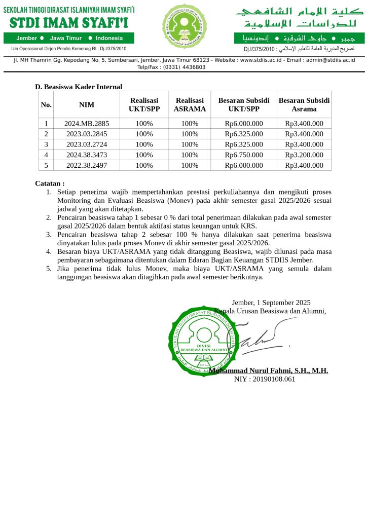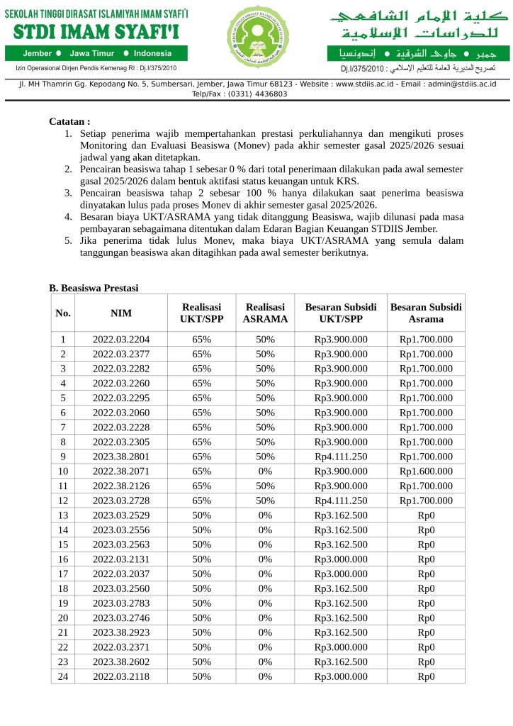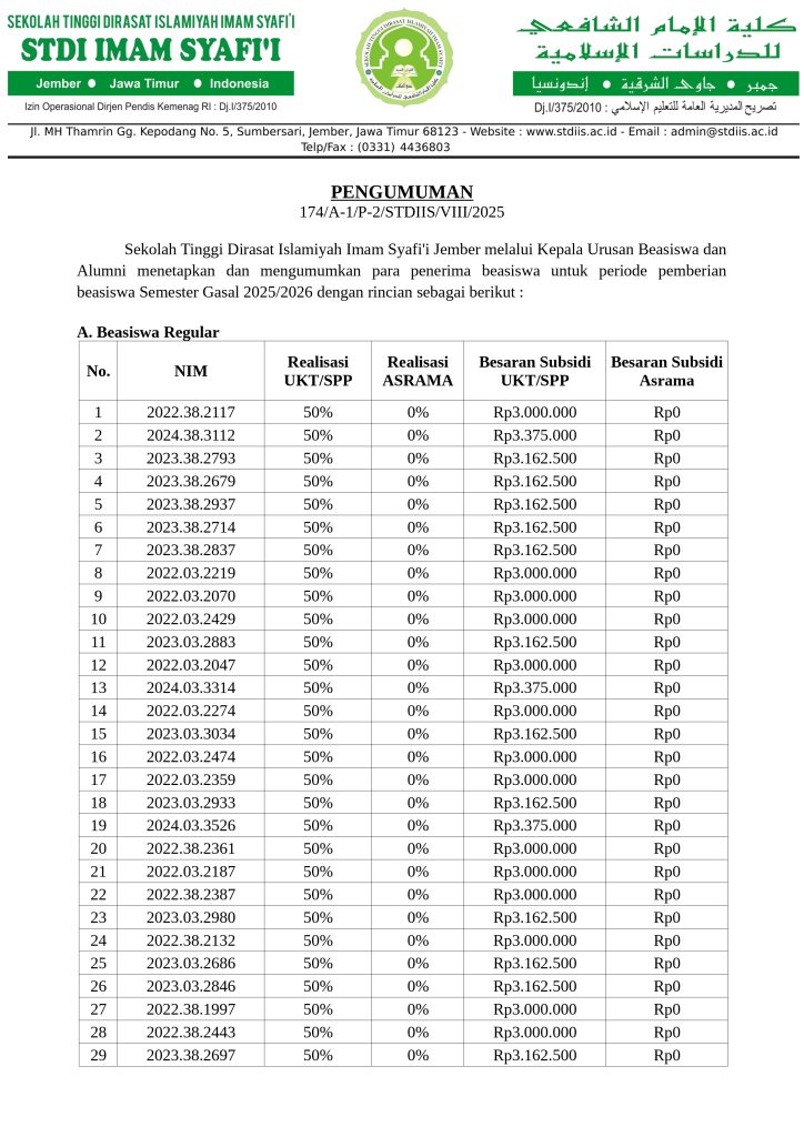 Sekolah Tinggi Dirasat Islamiyah (STDI) Imam Syafi’i Jember melalui Kaur Beasiswa dan Alumni dengan ini mengumumkan nama-nama mahasiswa yang menerima Beasiswa Semester Gasal Tahun Akademik 2025/2026.